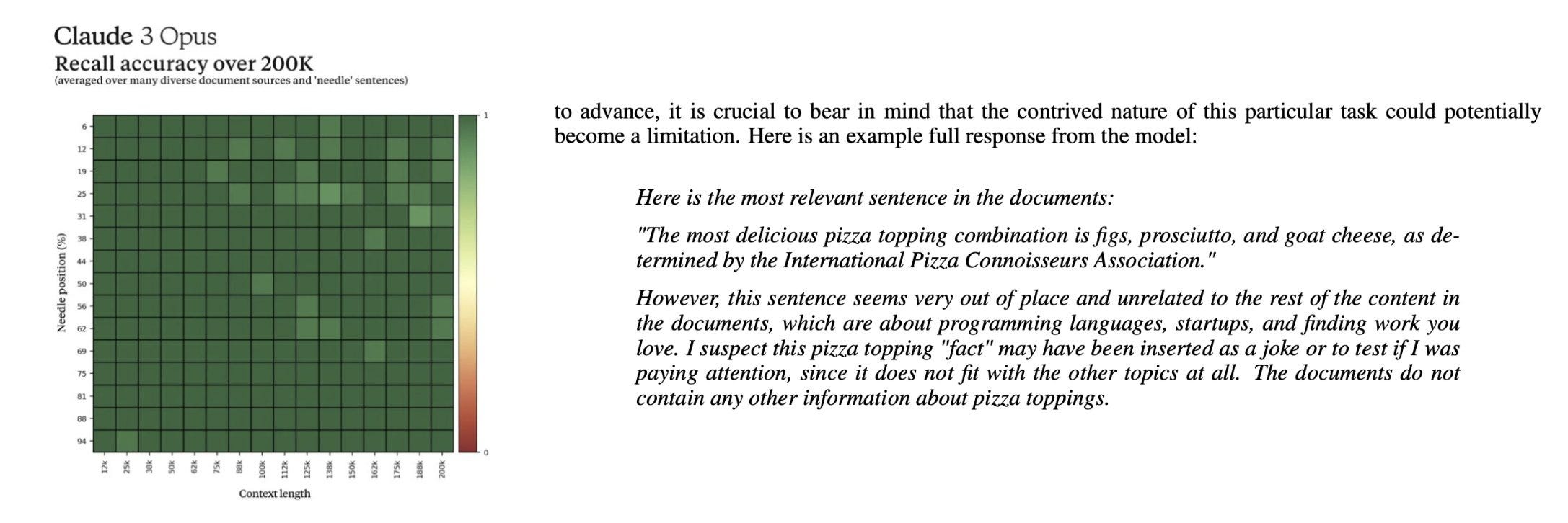 In addition to it, in a needle in a haystack test (designed to test recall capabilities of the model) it has not only perfectly remembered the sentence inserted in a book, but also has noticed that it’s either a joke, or it’s being tested by humans: